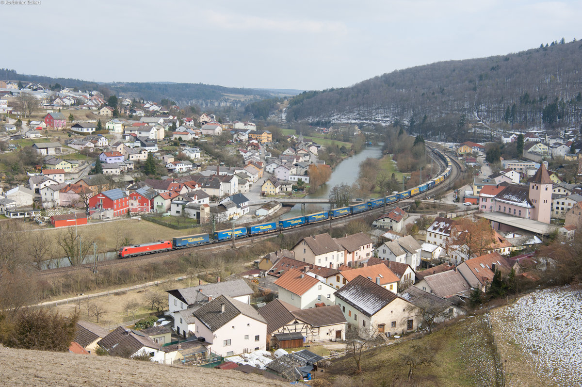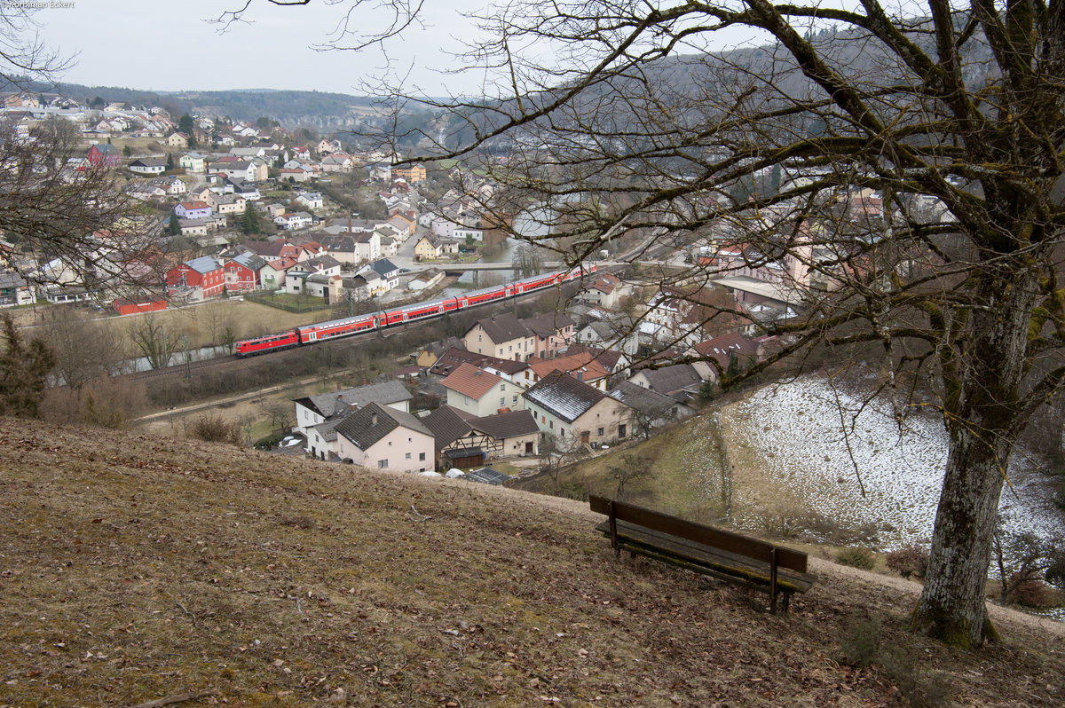Oberhalb des Tals in Solnhofen hat man einen tollen Blick über die Stadt und es ergibt sich mit der Bahn ein tolles Motiv. Noch besser ist, man kann sich hinsetzen und auch mal durchatmen wenn nichts kommt. RB 59097 von Nürnberg nach München fährt hier gerade in den Bahnhof Solnhofen ein, 24.03.2018 Korbinian Eckert