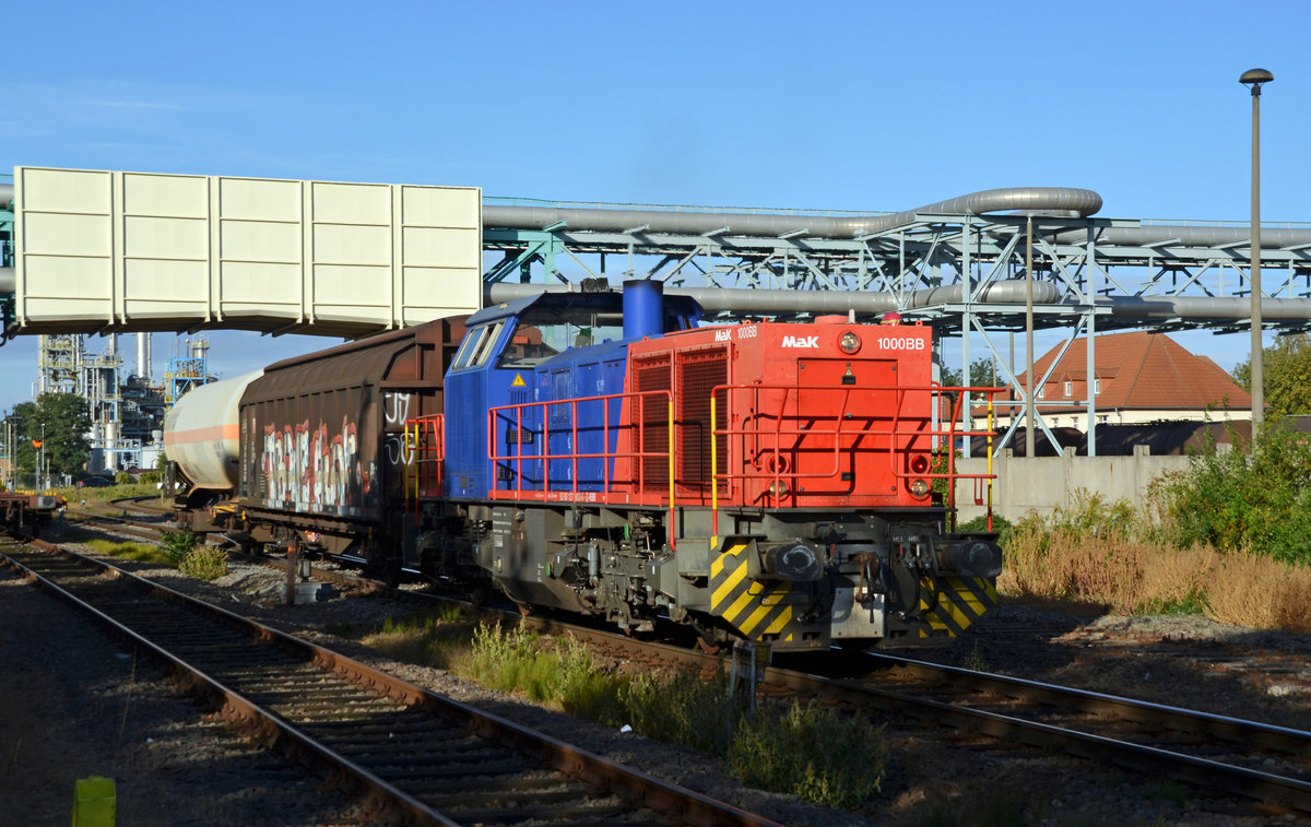 Bei der Regiobahn Bitterfeld wird seit einigen Wochen eine G1000 eingesetzt, welche zuvor bei den SBB im Einsatz war. Mit zwei Wagen rangiert 271 003 noch in den Farben des Vorbesitzers am 22.09.18 im Chemiepark Bitterfeld. Fotografiert von einem öffentlich zugänglichen Weg. Martin Schneider