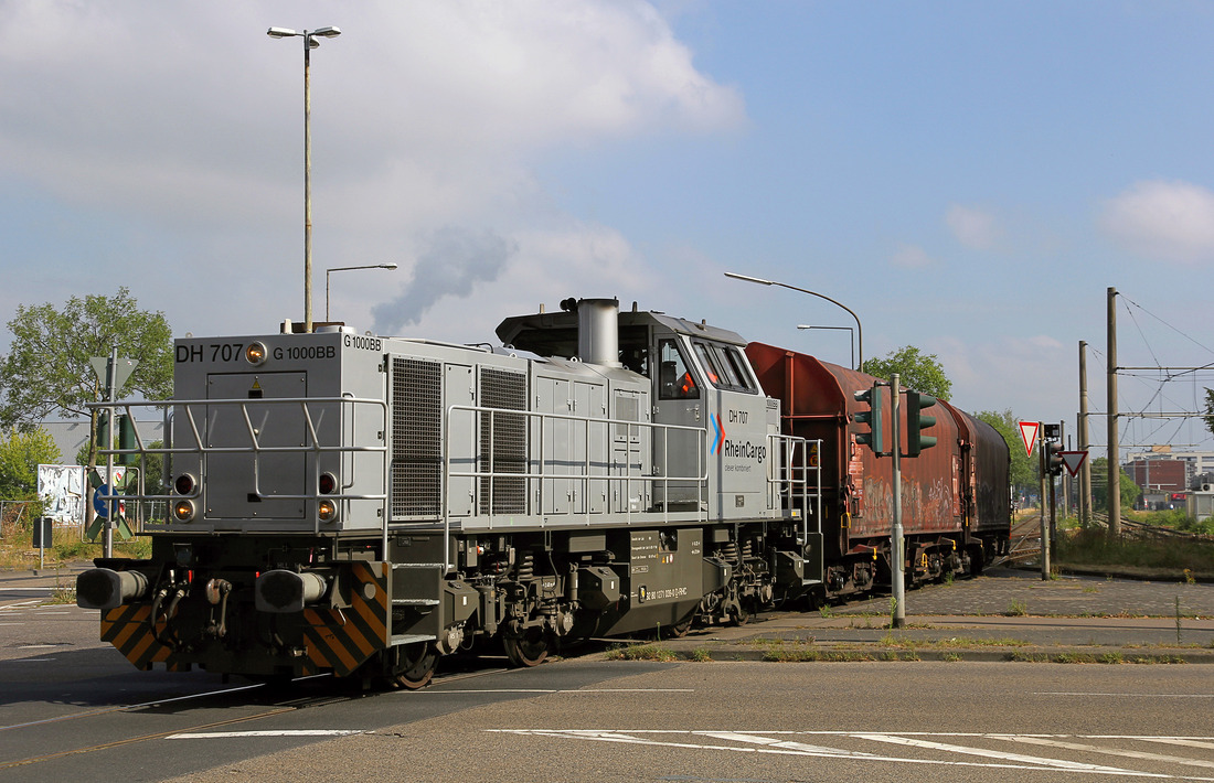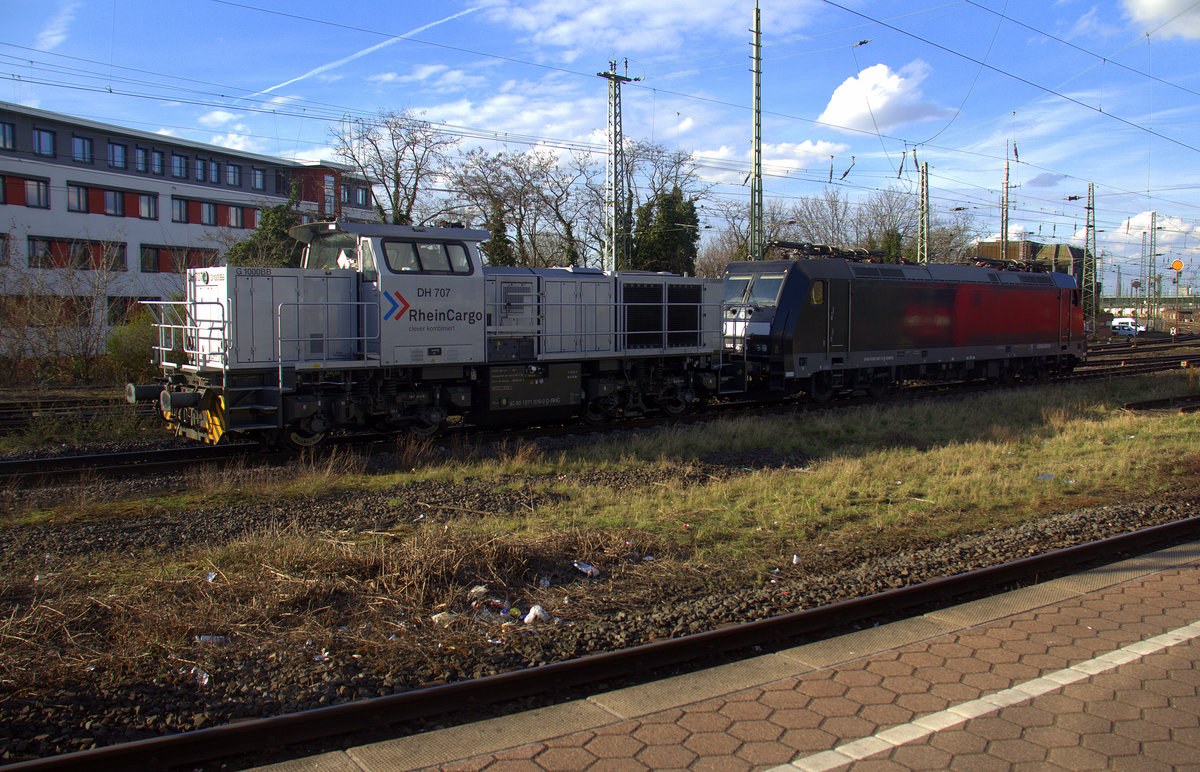 DH707 von der RheinCargo und 185 567-5 von MRCE rangiert in Neuss-Hbf.