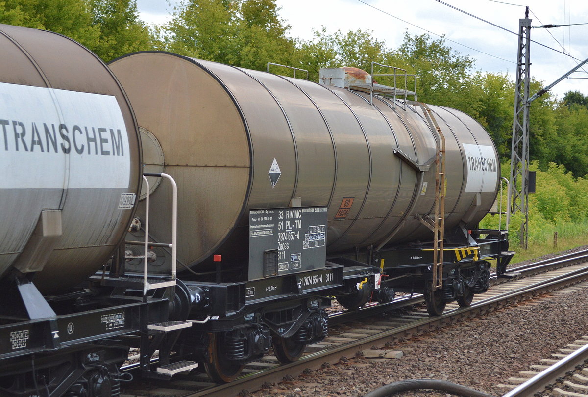 Kesselwagen der polnischen Fa. Transchem Sp. z o.o. mit der Nr. 33 RIV MC 54 PL-TM 7874 687-4 Zaces (Ladegut siehe UN-Nr.: 80/1824 = Natriumhydroxidlösungen (Natronlaugen)) am 11.07.18 Bf. Berlin-Hohenschönhausen. Lothar Stöckmann
