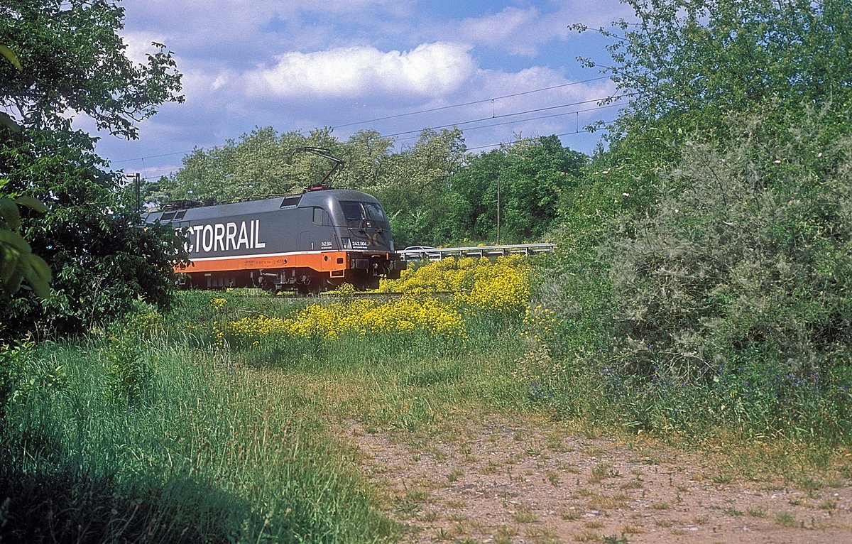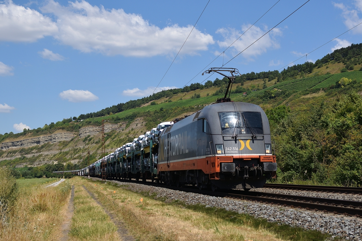 AM 25.05.2018 zieht ein unbekannter Taurus von Hectorrail einen Automobilganzzug mit neuen Volkswagen dem Knotenbahnhof Treuchtlingen entgegen. Die Aufnahme entstand vom Biergarten "Wettelsheimer Keller" während der Öffnungszeiten. Fluffy