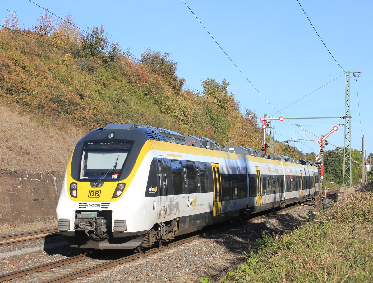 Einfahrt eines Talent 2-Triebzuges in den Bahnhof Winnenden. Der gläserne Steg verbindet zwei Betriebsgelände der bekannten Firma Kärcher, die ihren Sitz in Winnenden hat.