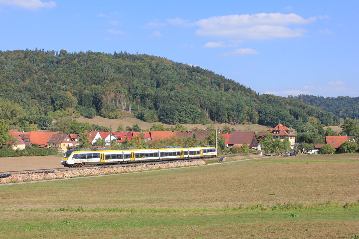 Am 29.09.2018 fährt das 798er-Trio "Roter Flitzer" im Zuge einer Sonderfahrt von Wackershofen nach Kornwestheim durch den Bahnhof Fichtenberg. Fluffy