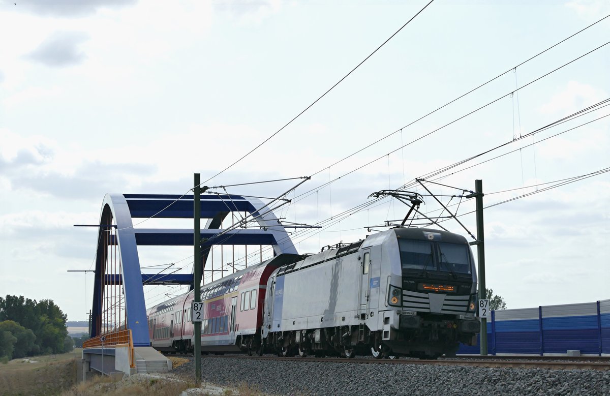 28.08.2018, Die Lokomotiven 193 804 und 193 802 befördern RE 4826 Nürnberg - Sonneberg über die Flutmuldenbrücke bei Wiesen, danach durch den Tunnel Eierberge. Jürgen Krause
