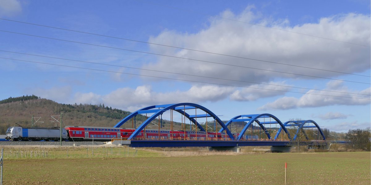 18. März 2018, ICE 1004 München - Berlin fährt auf der Hochgeschwindigkeitsstrecke Ebensfeld - Erfurt über die Flutmuldenbrücke bei Wiesen.Der Triebzug ist einer der "Sprinter", ICE 3-Tz 331 (ehemals "Westerland/Sylt") 403 031/531 jetzt ("Diese Strecke gehört..."), dekoriert mit zahllosen Unterschriften. Jürgen Krause