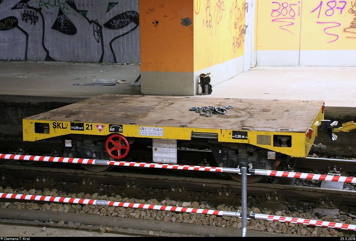 Blick auf einen SKL-Anhänger (99 80 9783 022-3 D-ATLAS) der Atlas GmbH, der im Zuge von Gleisbauarbeiten im Hp Halle-Neustadt auf der Bahnstrecke Merseburg–Halle-Nietleben (KBS 588) steht.