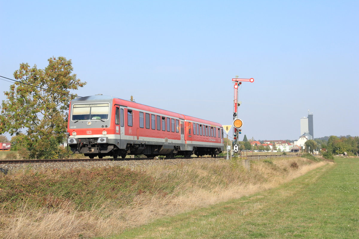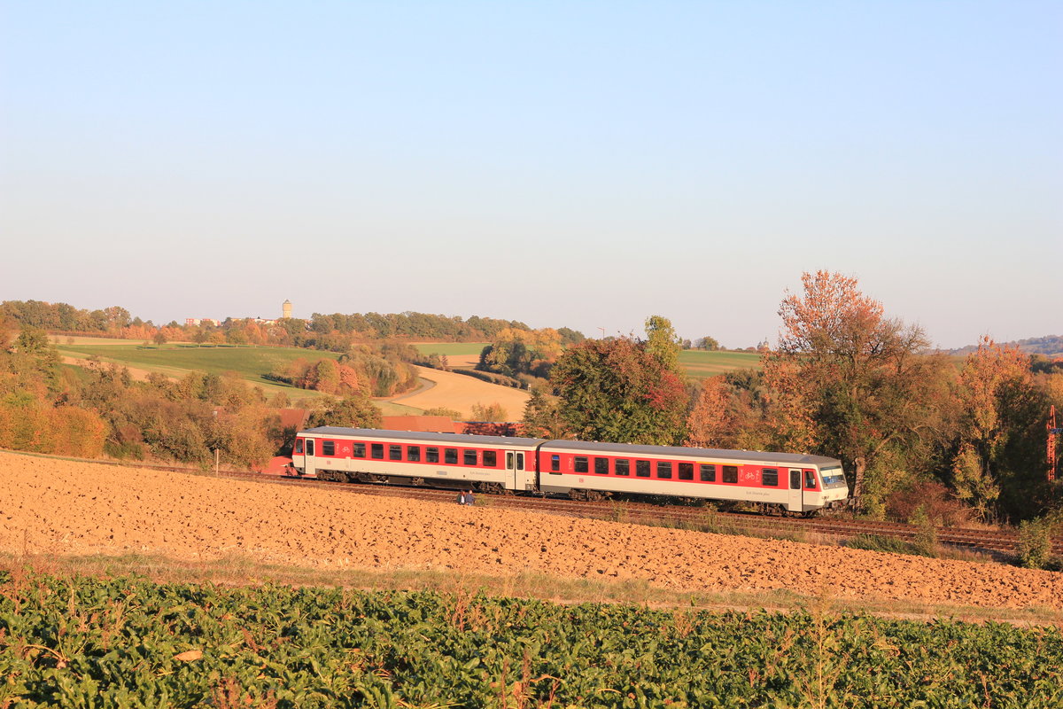 Am 21.10.2018 fährt 628 512 "Kampen" hinter Öhringen-Cappel als RB von Öhringen Hbf nach Hessental durch die herbstliche hohenloher Landschaft. Fluffy