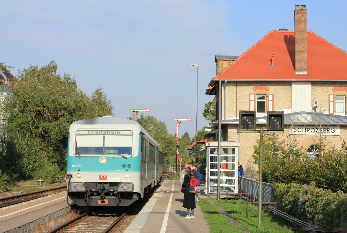 Am 28.09.2018 kreuzen 628 526 "Anna" als RE "Main-Tauber-Express" Aschaffenburg-Crailsheim und 628 225 als RB Crailsheim-Würzburg im Bahnhof Schrozberg. Fluffy