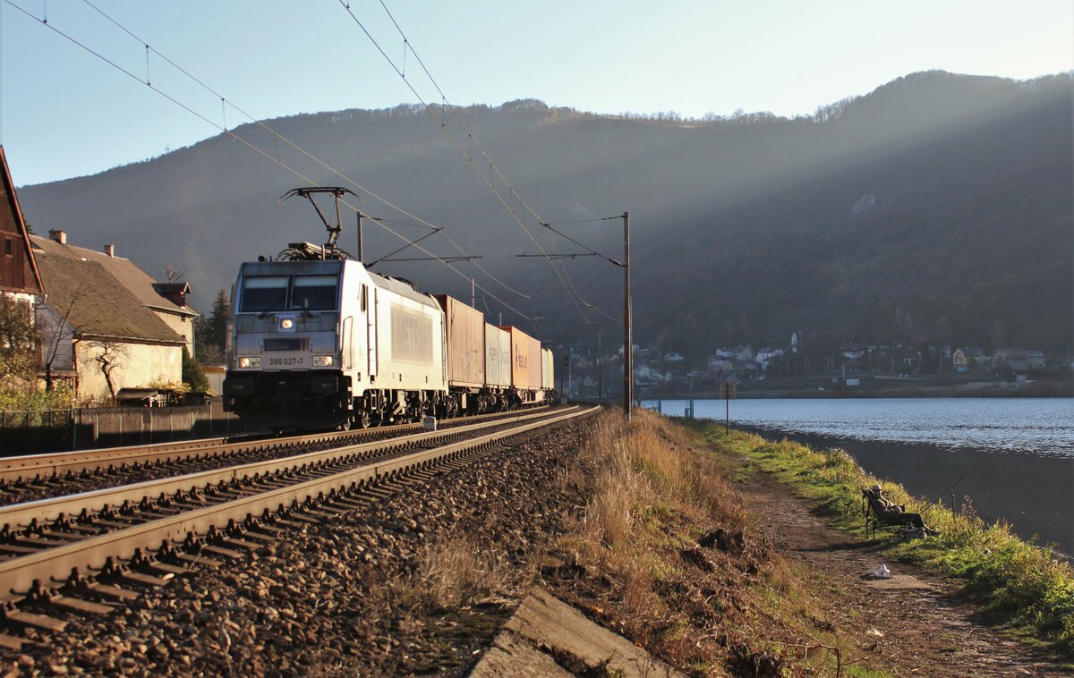 386 027-7 (Metrans) war am 17.11.18 mit einem Containerzug in Ústí nad Labem-Střekov zu sehen.