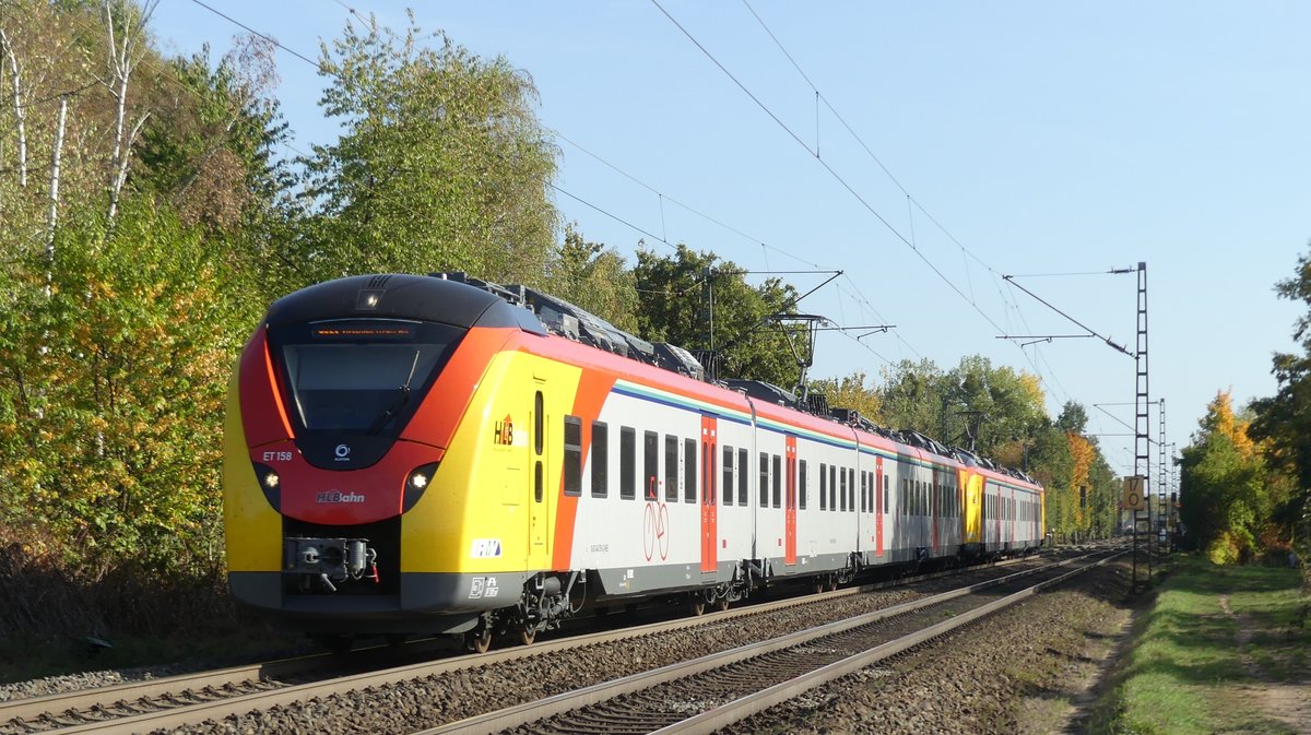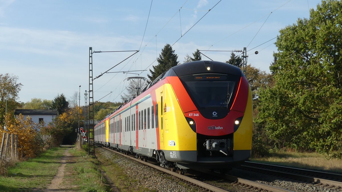Coradia Continental 2 der HLB auf Abwegen bei Frankfurt. Die Strecke Höchst-Bad Soden wird trotz Elektrifizierung nur vorübergehend elektrisch bedient. Dezember 2018. Olli