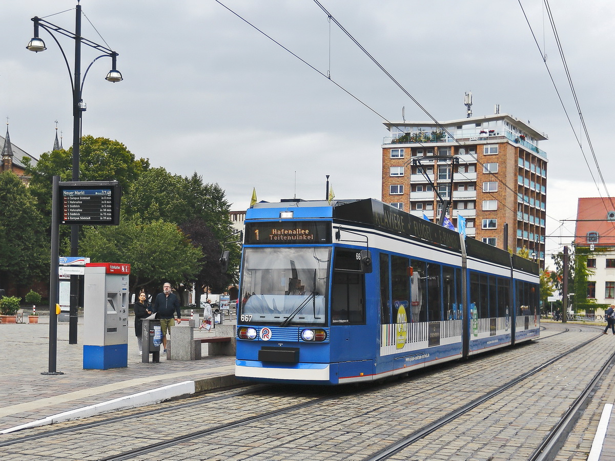 Wagen 674 der Rostocker Straßenbahn mit Linie 1 nach Rügener Str. / Lüttgen Klein an der Haltestelle Kröpeliner Tor am 27. August 2018. Klaus-P. Dietrich