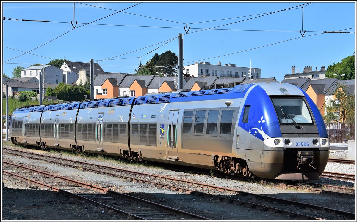 Der SNCF Z 27 582 verlässt als TER 895052 den Bahnhof Meroux (TGV) Richtung Belfort, im Hintergrund, hinter dem grünen Ausfahrsignal, ist der alte Bahnhof von Meroux zu erkennen.