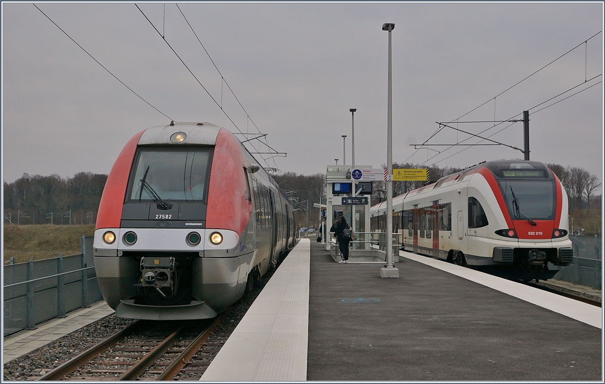Im vollständige neu gebauten Bahnhof Meroux warten der SNCF Z 27 582 nach Belfort und der SBB RABe 522 210 nach Biel/Bienne auf die Abfahrt.