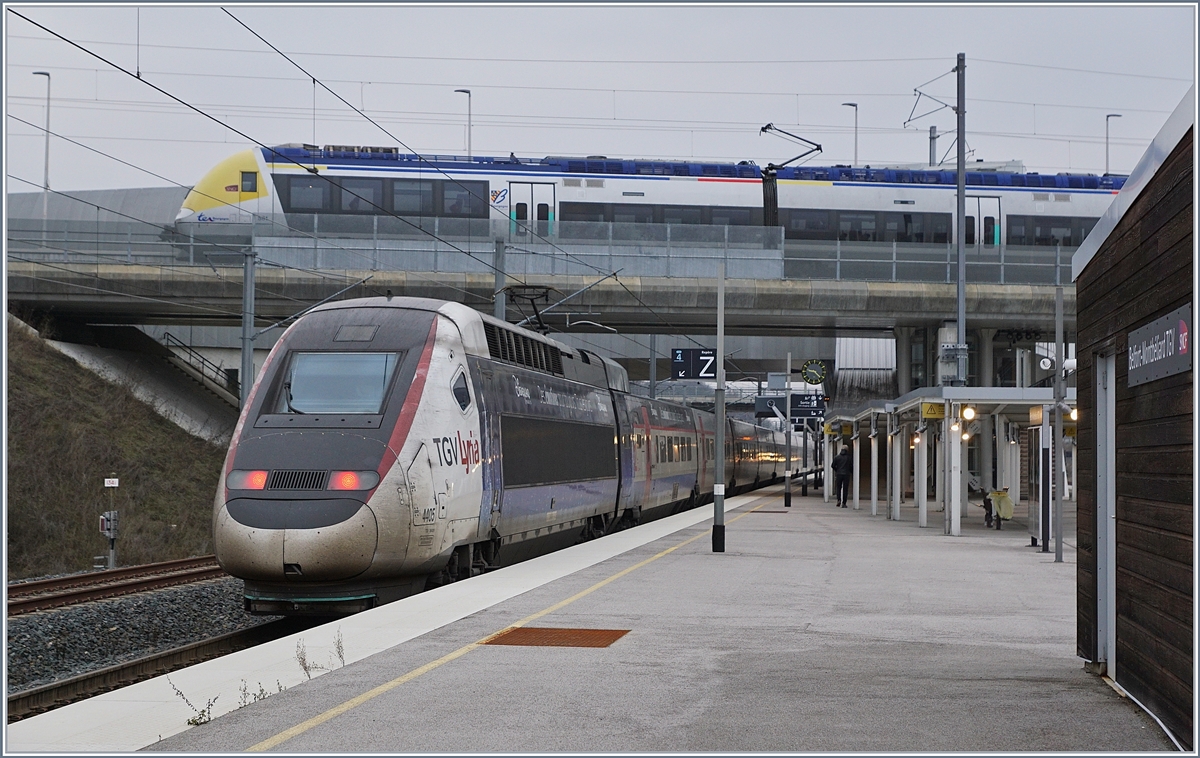 Im oberen Bildteil steht der SNCF Z 27582 im Bahnhof von Meroux (TGV), während im unteren Bildteil der TGV Lyria 9206 den Bahnhof Belfort-Montbeliard TGV verlässt, um planmässig erst wieder an seinem Ziel, in Paris Gare de Lyon anzuhalten.