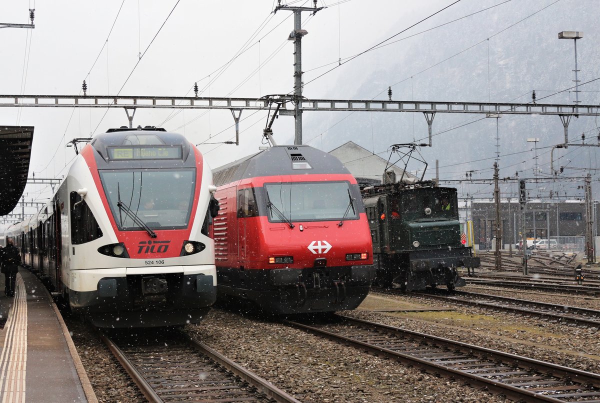 Kleine Fahrzeugparade in Erstfeld: Links der SBB/Trenitalia TILO RABe 524 106 als RE aus Milano C. ausnahmsweise auf Gleis 1, in der Mitte die SBB Re 460 118 "Gotthard/Gotthard" mit dem IR Olten/Zürich HB - Erstfeld auf Gleis 3 und rechts die Ae 4/7 10976 mit einem Sonderzug (EXT) aus Nürnberg/Frankfurt nach Locarno ankommen.