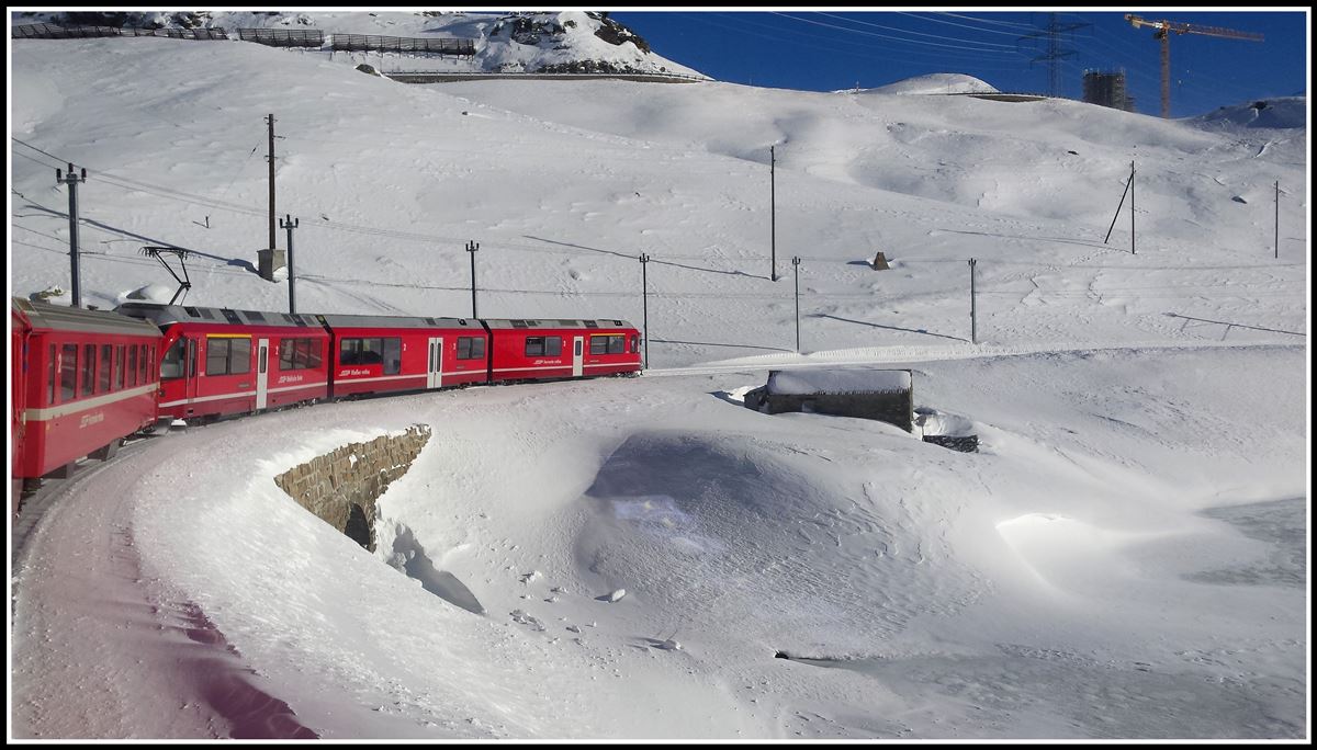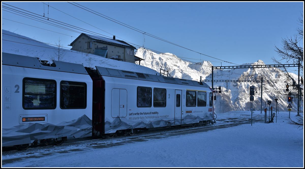 Zur Zeit verkriecht sich die Sonne auf Alp Grüm bereits um 14.00Uhr hinter dem Piz Palü. Der weisse Allegra ABe 8/12 3512 des R4637 nach Tirano verstärkt den Kälteeindruck noch zusätzlich. (11.12.2018) Herbert Graf