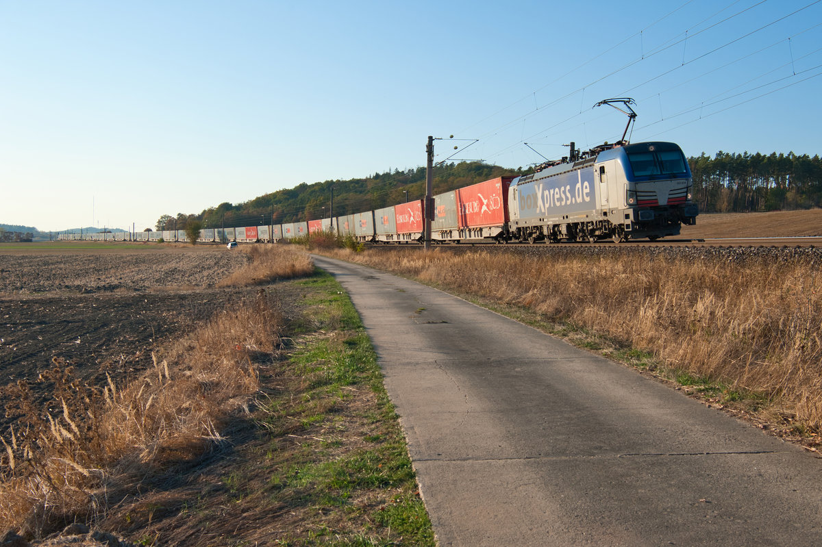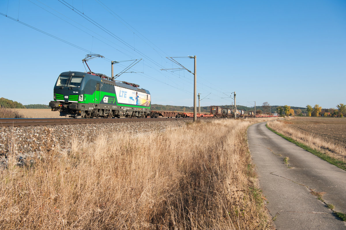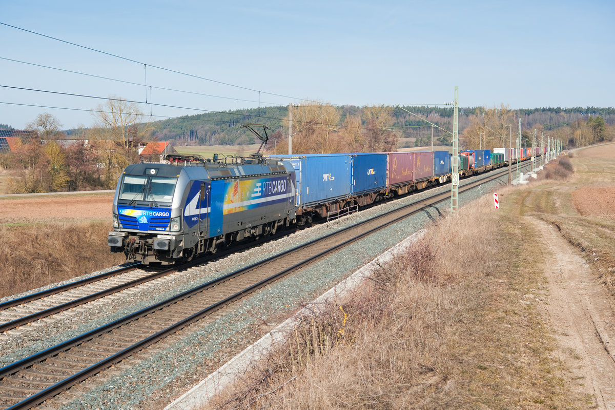AM 25.05.2018 zieht ein unbekannter Taurus von Hectorrail einen Automobilganzzug mit neuen Volkswagen dem Knotenbahnhof Treuchtlingen entgegen. Die Aufnahme entstand vom Biergarten "Wettelsheimer Keller" während der Öffnungszeiten. Fluffy