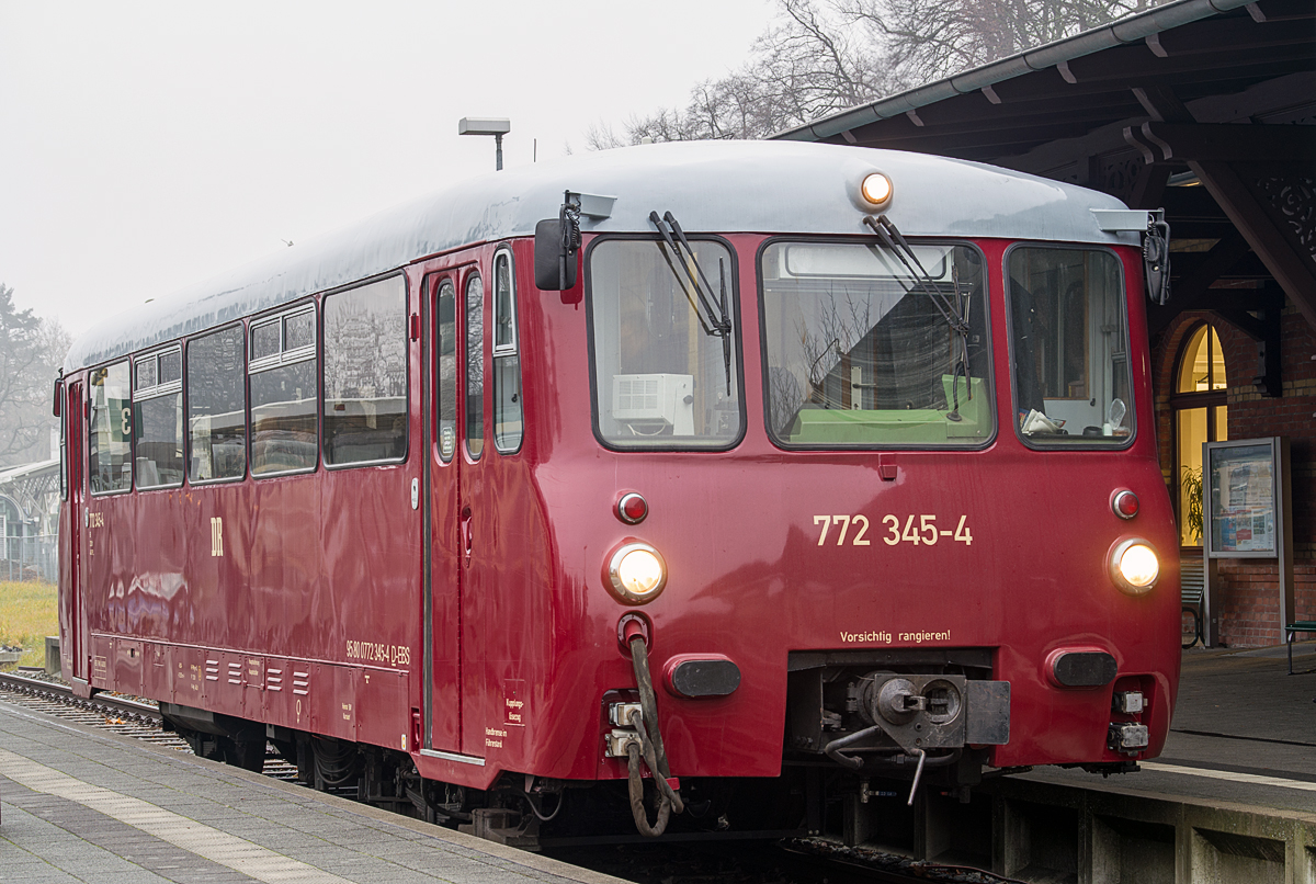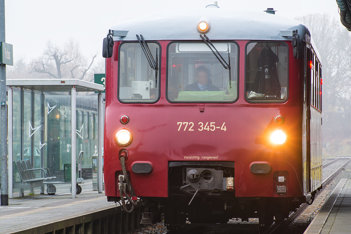 Ferkeltaxi 772 345 der Erfurter Bahnservice GmbH (EBS) am Bahnsteig 1 in Putbus. - 01.12.2018 - Am Reisendenübergang zum Kleinbahnhof aufgenommen. Gerd Wiese