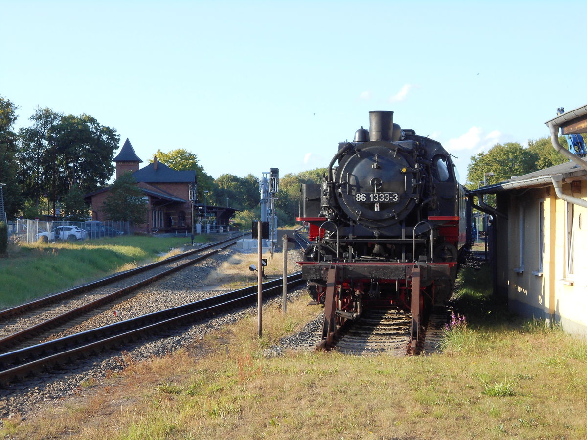 Gegen 18:00 Uhr hatte 86 1333,am 08.Juli 2018,ihr Tagessoll auf der KBS 198 erreicht und dampfte zum Feierabend an den Kohlebansen in Putbus.Aufnahme von der dortigen Tankstelle aus. Mirko Schmidt