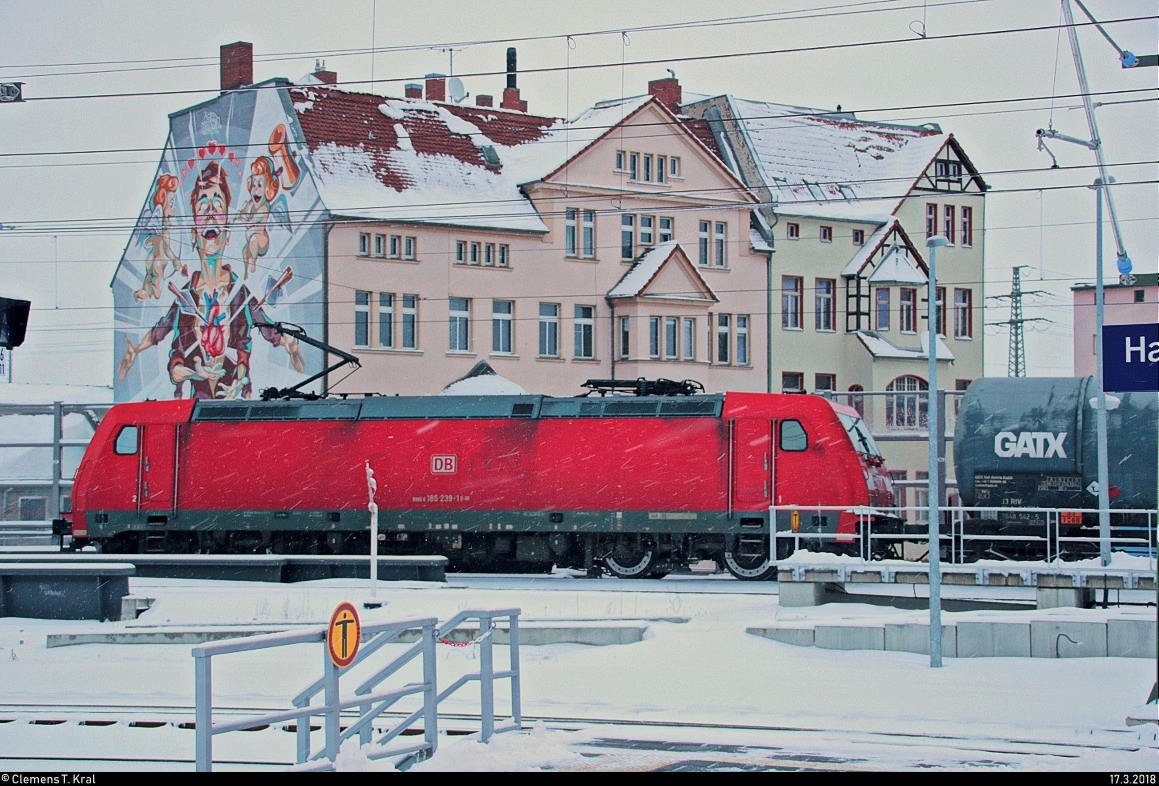 185 239-1 DB als Kesselzug steht kurzzeitig in Halle(Saale)Hbf Gl. 13a, vor einem Wandbild der "Freiraumgalerie" in der Delitzscher Straße bei Schneetreiben. [17.3.2018 | 18:05 Uhr] Clemens Kral