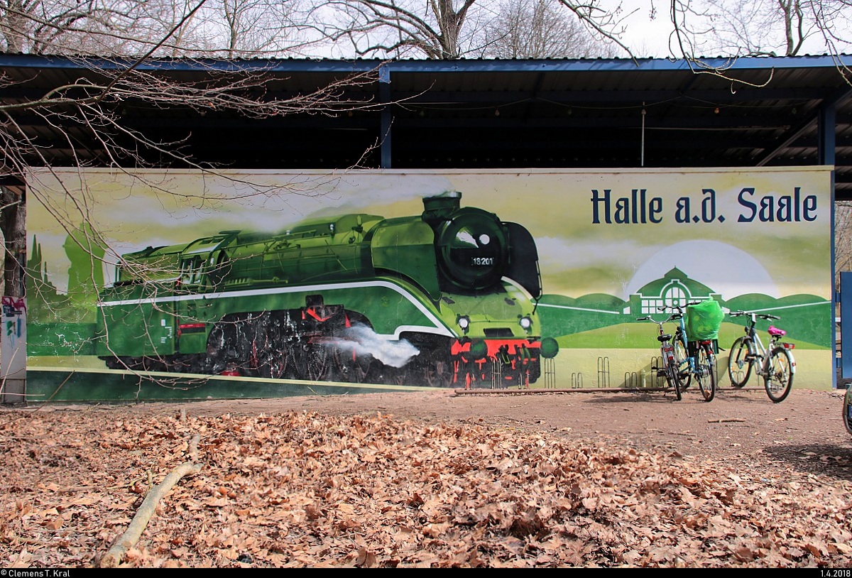 Blick auf ein besonderes Wandmotiv mit 18 201 und Halle(Saale)Hbf, das am Eingang zum Bahnhof Peißnitzbrücke der Parkeisenbahn "Peißnitzexpress" Halle (Saale) zu finden ist. [1.4.2018 | 13:50 Uhr] Clemens Kral