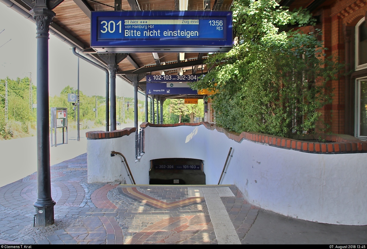 Blick von Bahnsteig 102/103 auf das Empfangsgebäude. Kein Mensch ist zu sehen, denn alle Fahrgäste sind aufgrund sehr heißer Temperaturen in den Schatten geflüchtet.