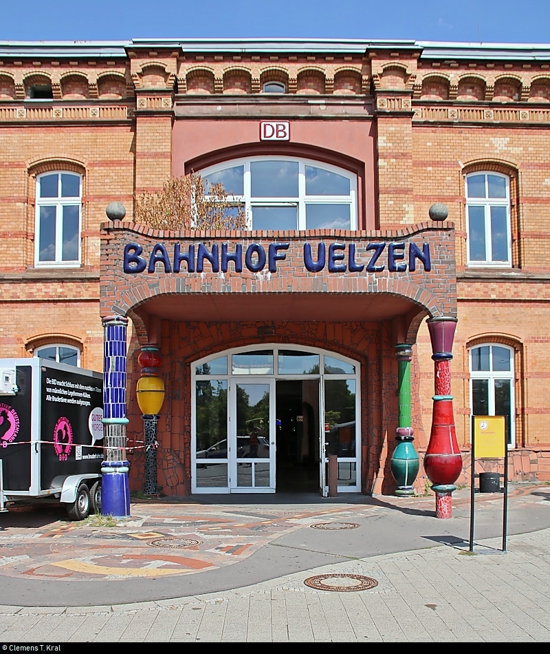Blick auf den Eingang zum Empfangsgebäude, das im Jahr 2000 als weltweites Projekt der Weltausstellung Expo 2000 nach dem Konzept des inzwischen verstorbenen Künstlers Friedensreich Hundertwasser umgebaut wurde. Auch die Bahnsteiganlagen wurden im Hundertwasser-Stil errichtet.