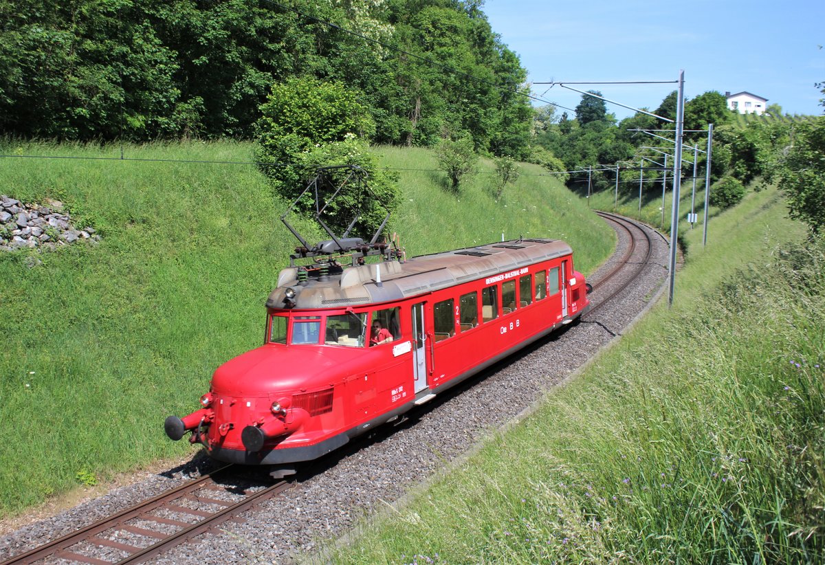 «Tagblatt»-Leserreise mit dem Roten Pfeil: Der RBe 2/4 Nr. 202 der OeBB ist unterwegs am Pfingstmontag, 21. Mai 2018 zwischen Thalheim-Altikon und Ossingen. Nicolas K.