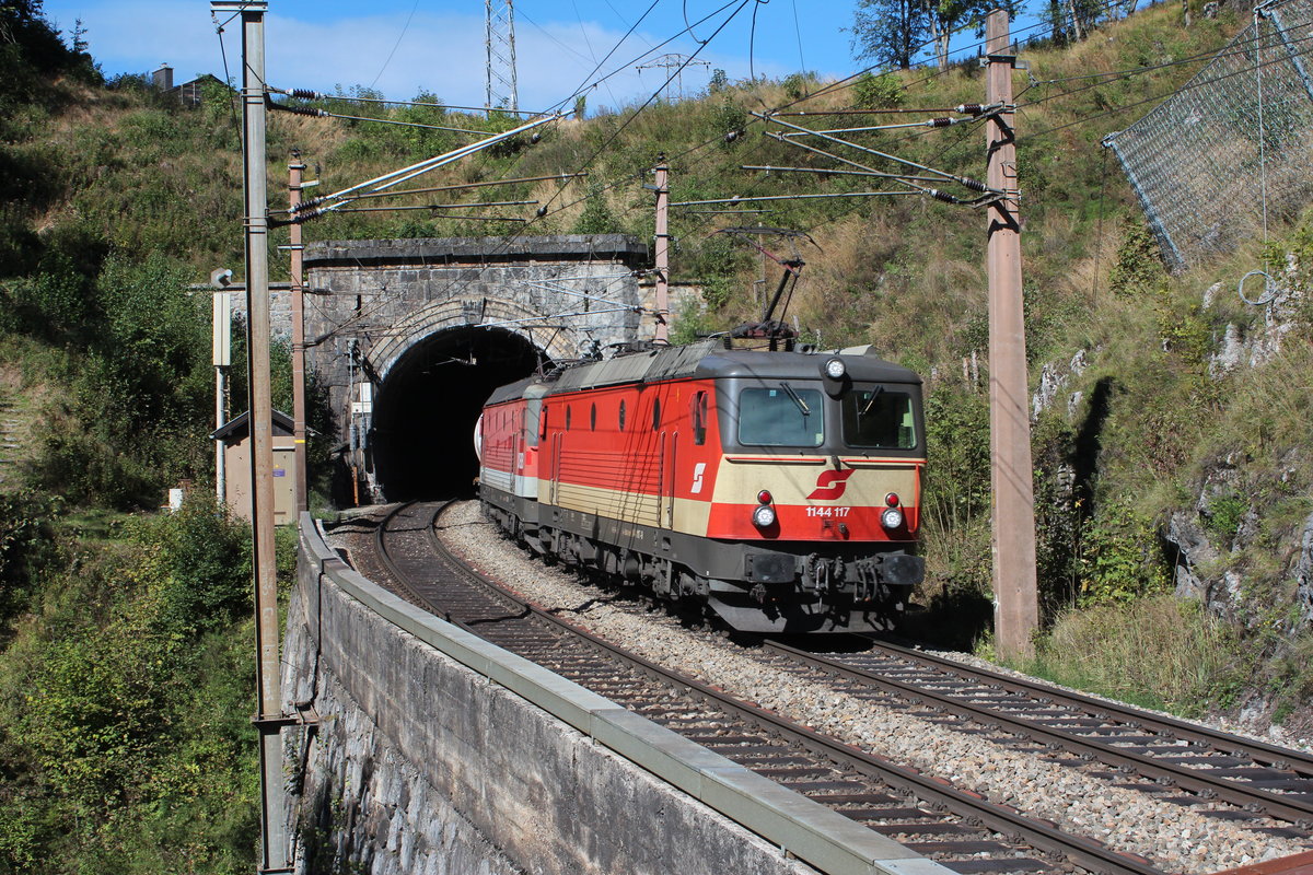 Der RID48434 nach Groß Schwechat ist am 27.9.2018 bespannt mit der 1144 117 und 1144 075 vorn und der 1144 092 als Nachschiebe-Tfz hier kurz vor der Einfahrt in den Weinzettelwandtunnel. Max Kiegerl