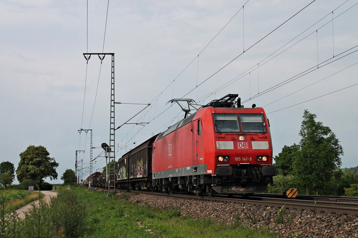 Am 08.06.2018 bespannte 185 141-9 einen gemischten Güterzug (Mannheim Rbf - Chiasso Smistamento), als sie nörldich von Müllheim (Baden) in Richtung Basel fuhr. Tobias Schmidt