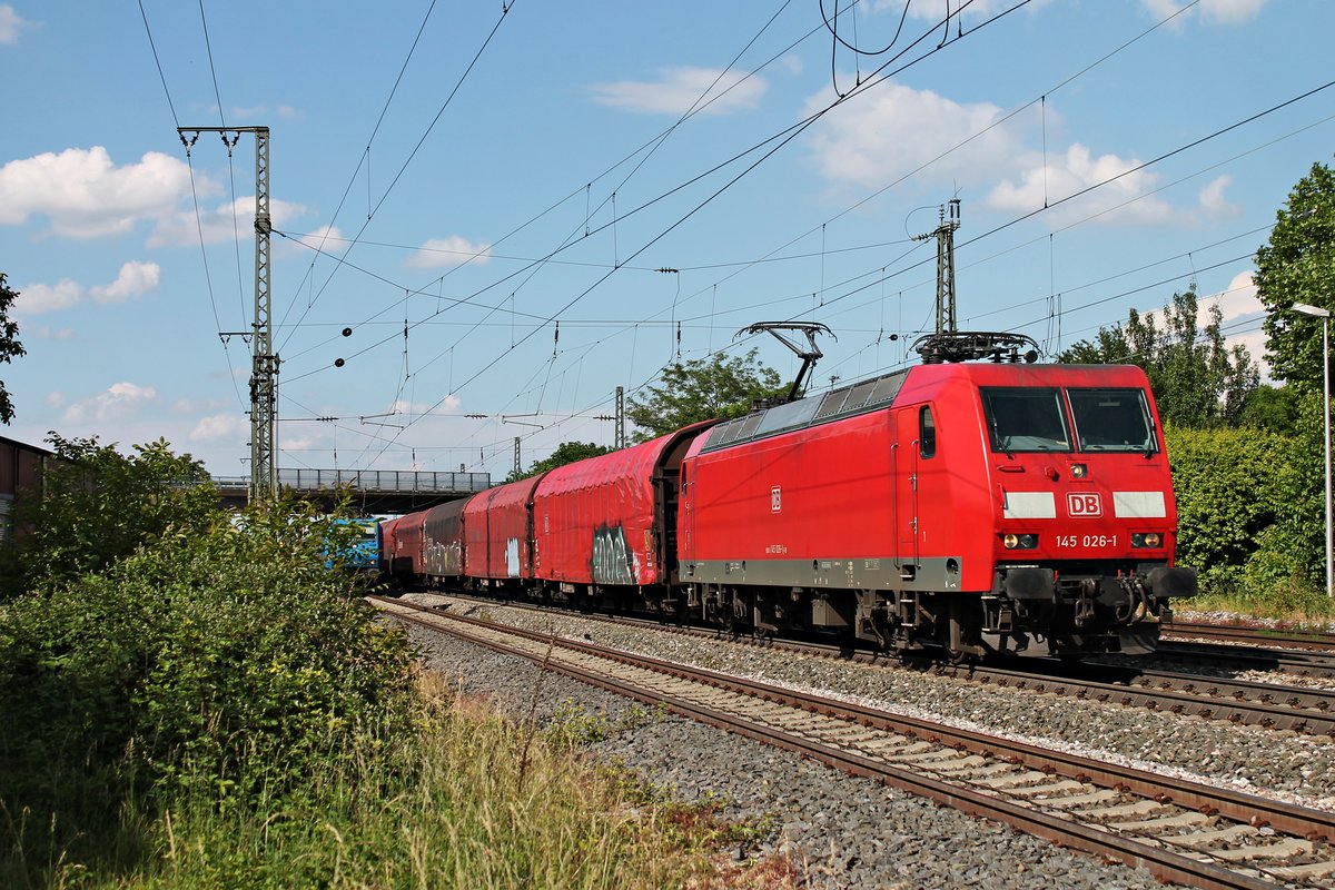 Mit einem gemischten Güterzug (Mannheim Rbf - Basel Bad Rbf) fuhr am Nachmittag des 24.05.2018 die 145 026-1 durch den Bahnhof von Müllheim (Baden) über die Rheintalbahn in Richtung Zielbahnhof, welcher nur noch wenige Kilometer entfernt war. Tobias Schmidt