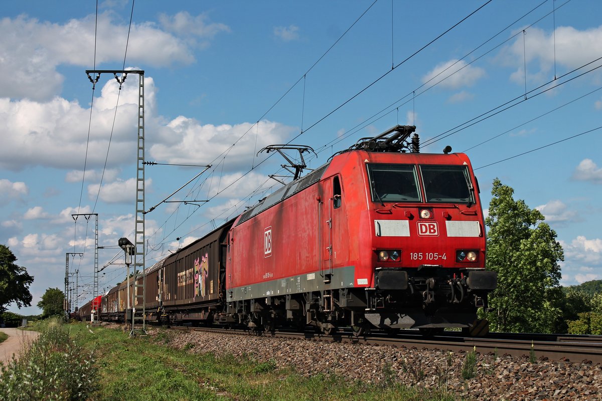 Mit einem gemischten Güterzug (Mannheim Rbf - Chiasso Smistamento) fuhr am 01.06.2018 die 185 105-4 zwischen Hügelheim und Müllheim (Baden) über die KBS 703 durchs Rheintal in Richtung Schweiz. Tobias Schmidt