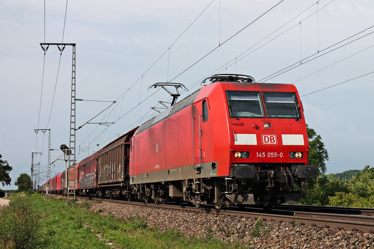 Mit einem gemischten Güterzug (Mannheim Rbf - Chiasso Smistamento) fuhr am 08.06.2018 die 145 055-0 nördlich von Müllheim (Baden) durchs Rheintal in Richtung Schweizer Grenze. Tobias Schmidt