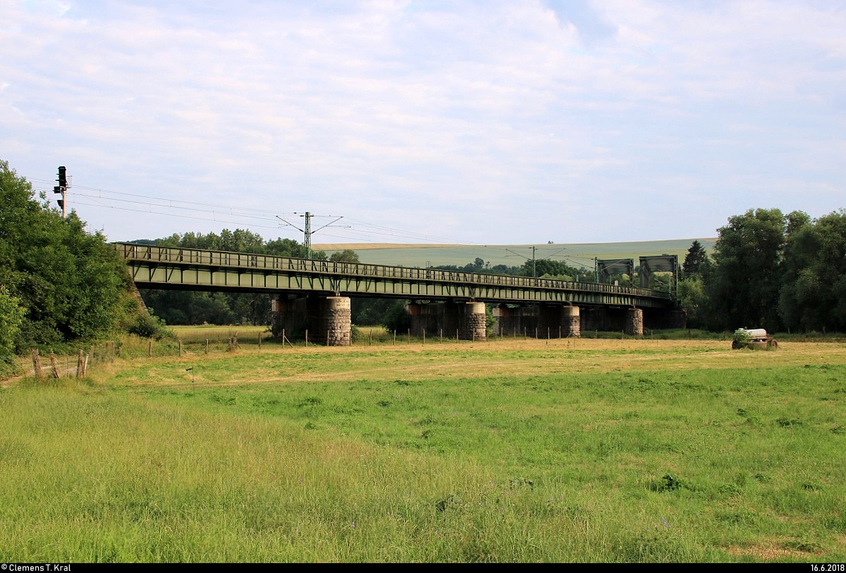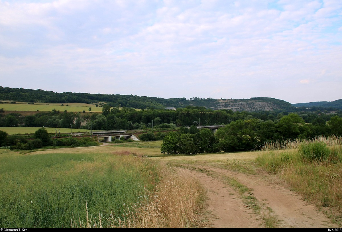 Blick auf die Bahnbrücke der Verbindungsbahn Ost auf der Bahnstrecke Großheringen–Saalfeld (KBS 560), kommend von Saaleck.