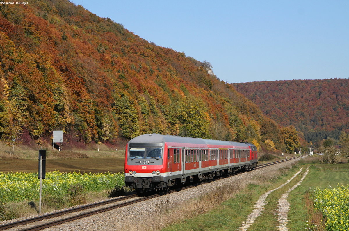 Zwischen Dietfurt und Inzigkofen, kurz nach der Einmündung der Schmeie in die Donau, fährt der von Donaueschingen kommende 612 052 am 06.10.2018 als RE 3213 nach Ulm. Jürgen Vos