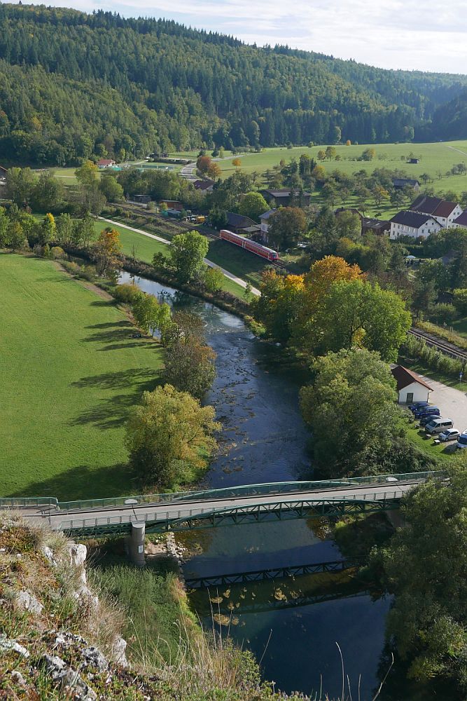 Zugsuchbild im oberen Donautal - oder - Der Schatten des Zuges ist größer als der Zug. Blick vom knapp 50 m hohen Kreuzfelsen auf RE 3212, der am 06.10.2018 auf der Fahrt von Ulm nach Donaueschingen das Gebäude des ehemaligen Bahnhofs von Gutenstein passiert. Jürgen Vos