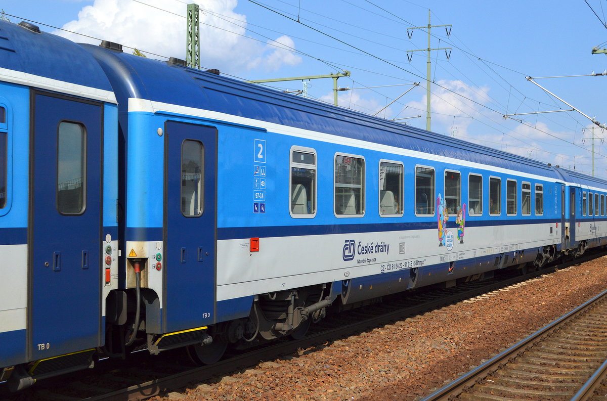 ČD - České dráhy a.s mit einem 2. Klasse Fernverkehrwagon (EC-Personenwagen) mit Kindersitzen mit der Nr. CZ-CD 61 54 20-91 015-3 Bhmpz 228 am 06.09.18 Bf. Flughafen Berlin-Schönefeld. Lothar Stöckmann