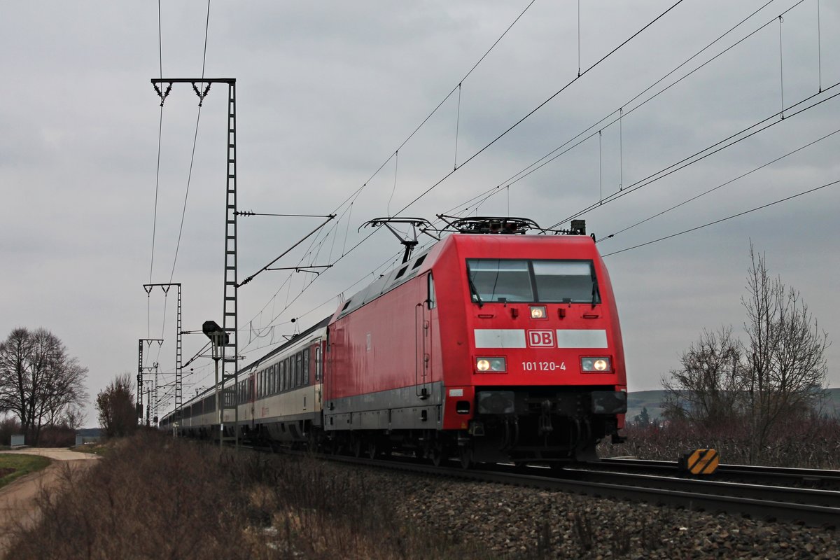 Am Nachmittag des 19.02.2018 bespannte 101 120-4 den EC 9 (Hamburg Altona - Zürich HB), als sie nördlich von Müllheim (Baden) in Richtung Schweizer Grenze fuhr. Tobias Schmidt
