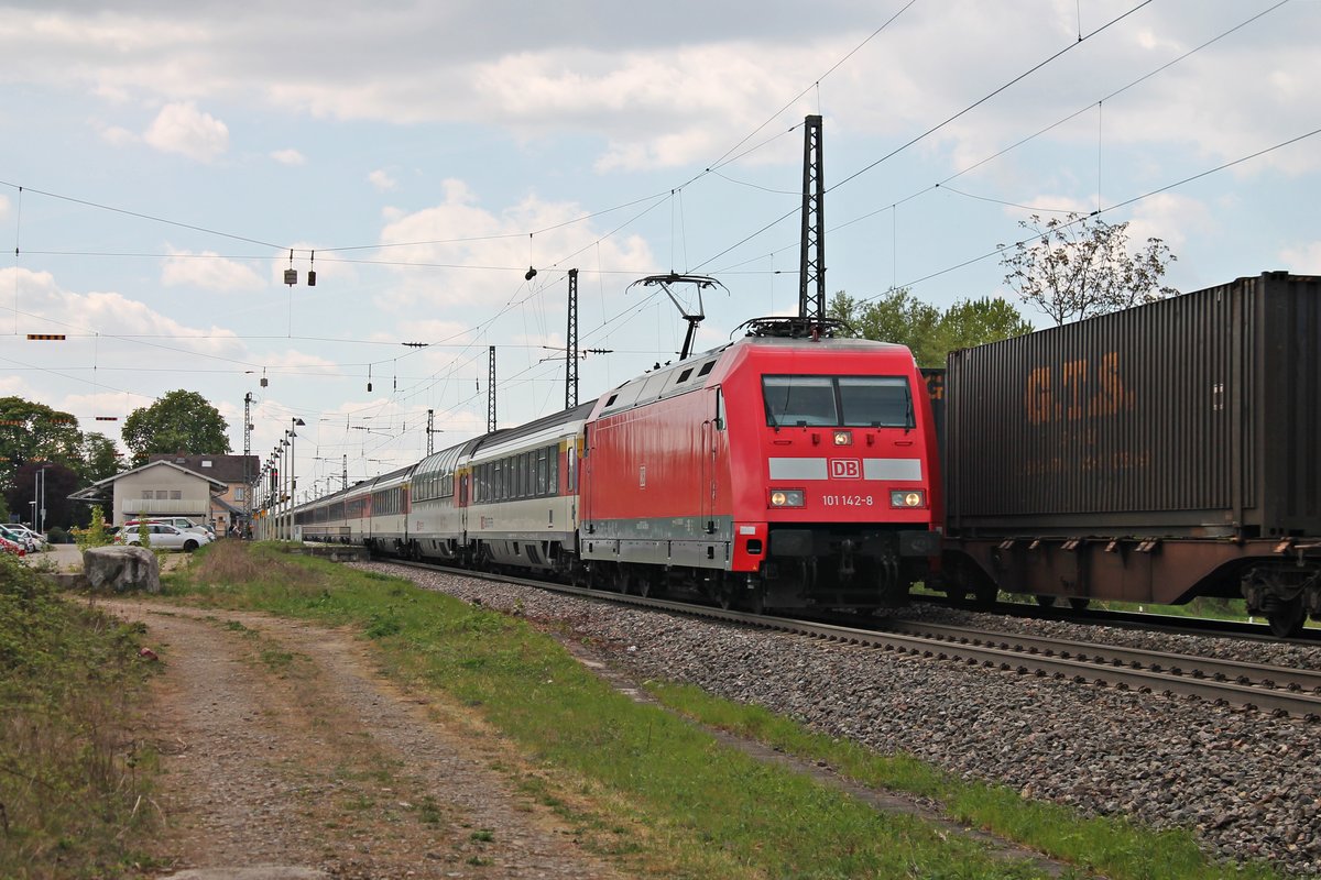 Durchfahrt am 13.04.2018 von 101 142-8 mit dem EC 8 (Zürich HB - Hamburg Altona) durch den Bahnhof von Heitersheim in Richtung Freiburg (Brsg) Hbf. Tobias Schmidt