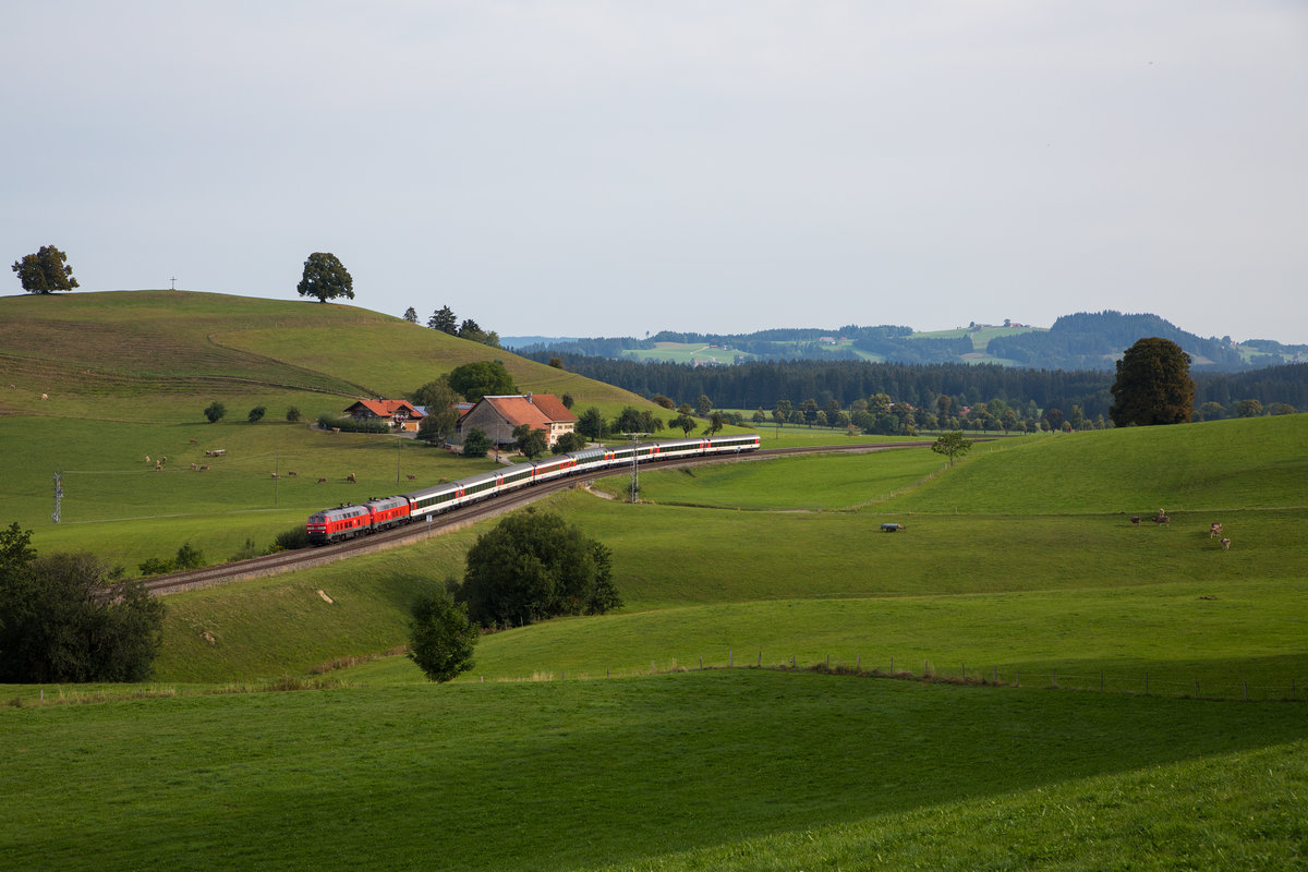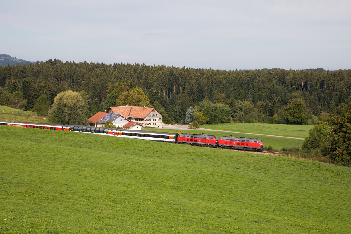 Am 24.08.2018 zieht 218 419-0 zusammen mit einer Schwestermaschine die von Basel SBB kommenden und in Lindau übernommenen Wagen des EC 193 nach München in der Nähe des Lindauer Ortsteils Schönau hinauf in das Allgäu Jürgen Vos