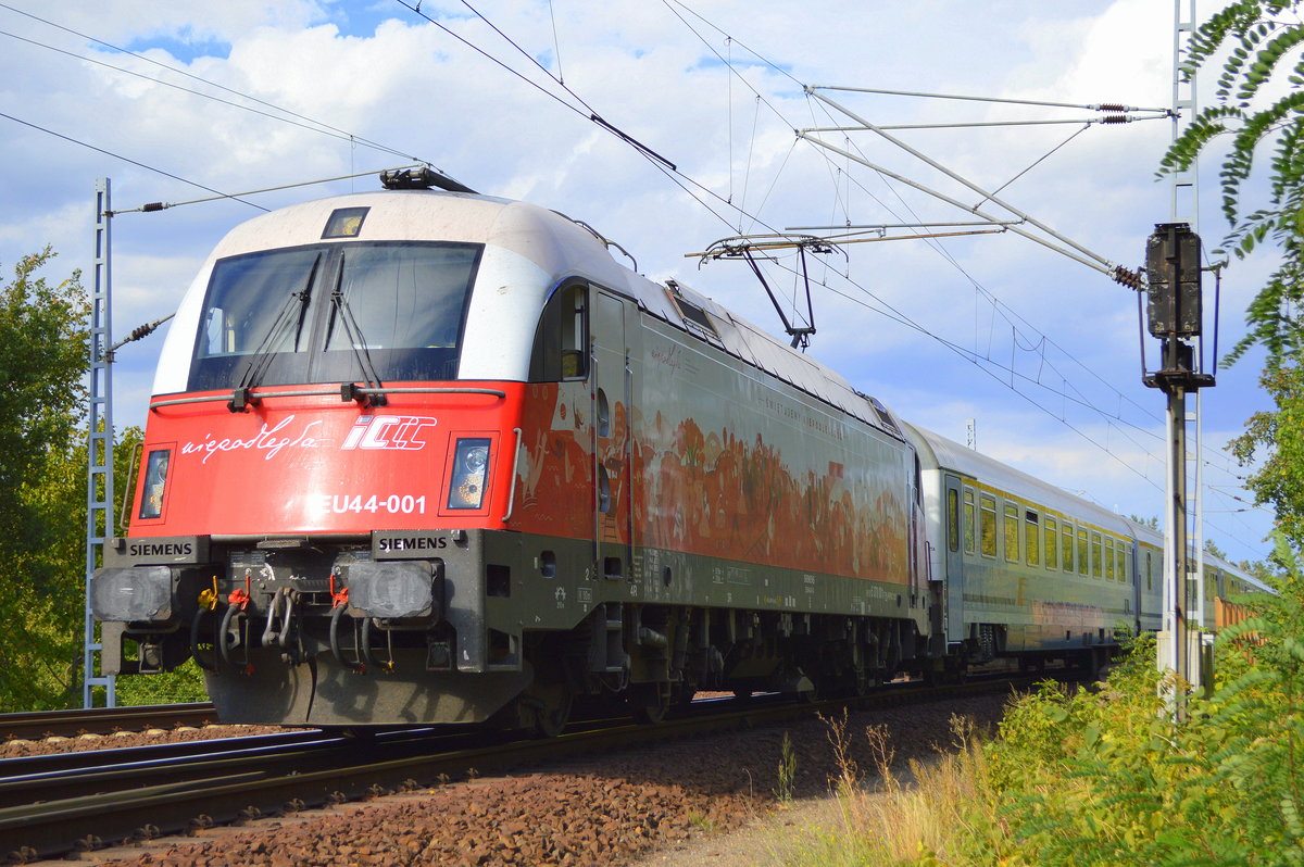 ČD - České dráhy a.s mit ELL Vectron "193 294" Name: Matěj [NVR-Number: 91 80 6193 294-6 D-ELOC] und EC Richtung Prag am 04.09.18 Bf. Flughafen Berlin-Schönefeld. Lothar Stöckmann
