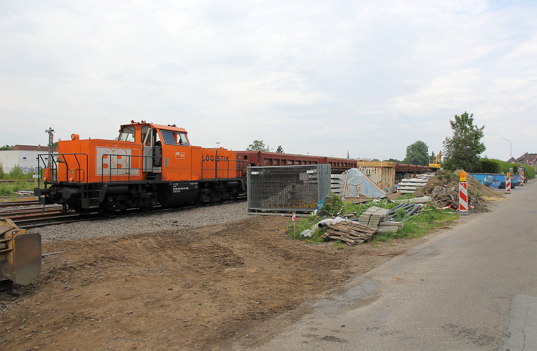 BBL 203 157-3 mit 5 Flachwagen dahinter mitgeführt BBL 214 002-8 und einem Schotterzug in Recklinghausen-Süd 16.5.2018