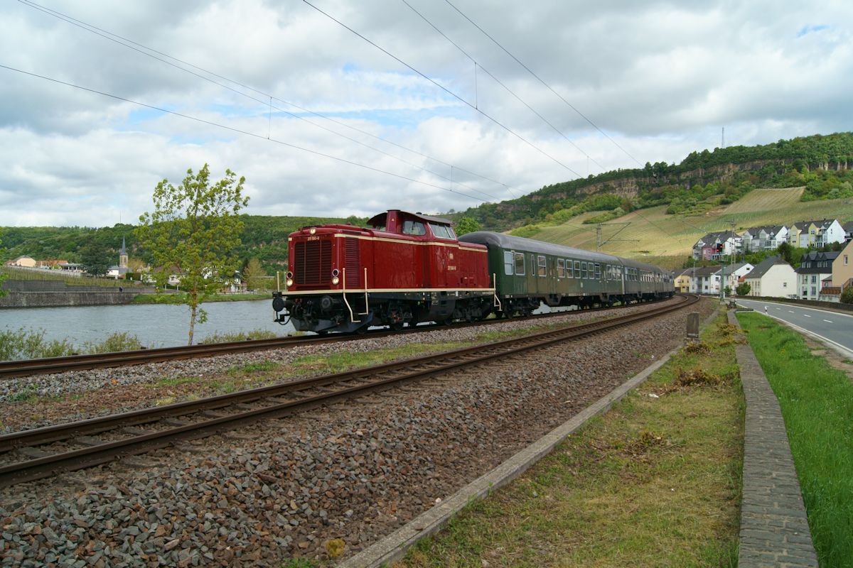 Anlässlich des Dampfspektakels 2018 wurden die Strecken um Trier mit historischen Zügen befahren. Am 28.4.2018 war DPE 61962 mit 211 041 an der Spitze kurz vor dem Haltepunkt Nittel unterwegs von Trier nach Nennig. Im Hintergrund ist die luxemburgische Ortschaft Machtum mit ihrer katholischen Kirche zu sehen. Michael Brunsch