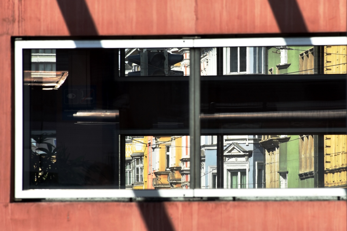 Da wird der Flexity (Bombardier Flexity Outlook) zum „Reflexity“ - Wagen 317 der Innsbrucker Verkehrsbetriebe verlässt als Linie 1 die Haltestelle Bergisel in Wilten (22.04.2018). Georg Friebe