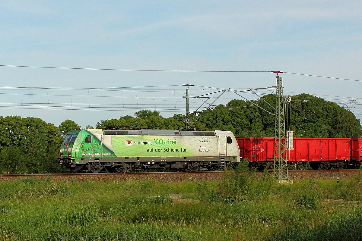Mit dem "DSV"-KLV (Taulov - Gallarate) fuhr am 19.05.2018 die 185 401-7 "Umweltfreundlich transportieren mit DB Cargo" nördlich von Müllheim (Baden) über die KBS 703 durchs Markgräflerland in Richtung Schweiz. Tobias Schmidt
