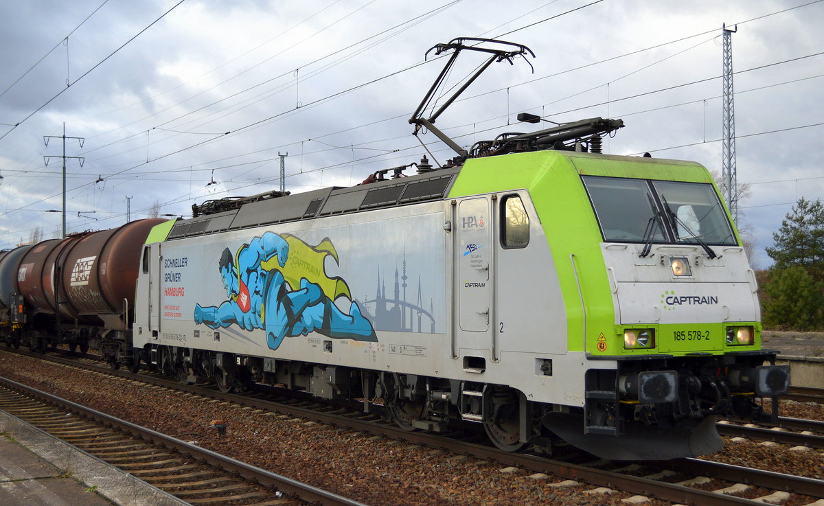 ITL mit der Captrain "185 578-2" [NVR-Number: 91 80 6185 578-2 D-ITL] und Kesselwagenzug (leer) Richtung Stendel am 08.12.18 Bf. Flughafen Berlin-Schönefeld. Lothar Stöckmann