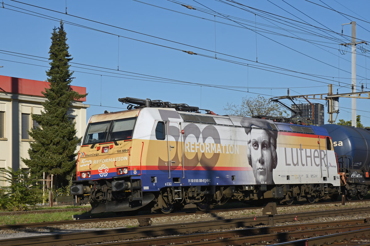 Silozug mit 185 589-9 der RheinCargo GmbH & Co. KG, auch bekannt als "Lutherlok", durchfährt den Bahnhof Pratteln (CH) in westlicher Richtung.