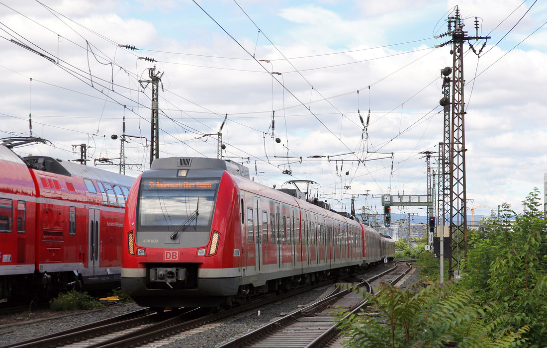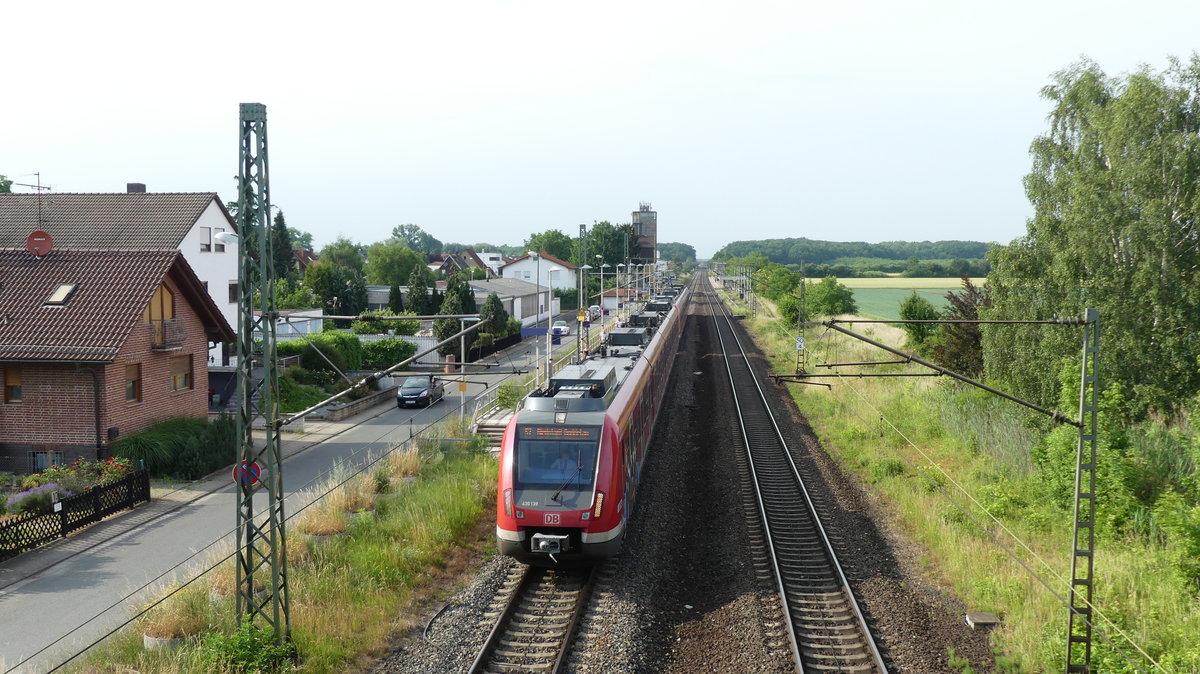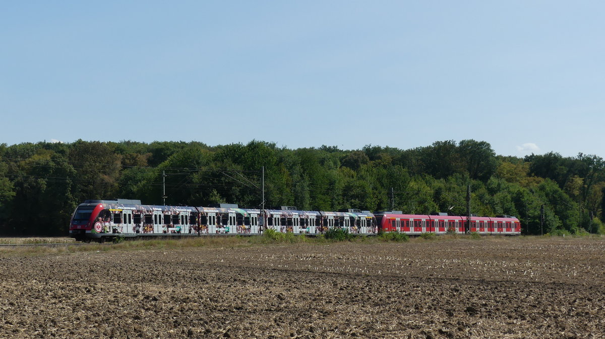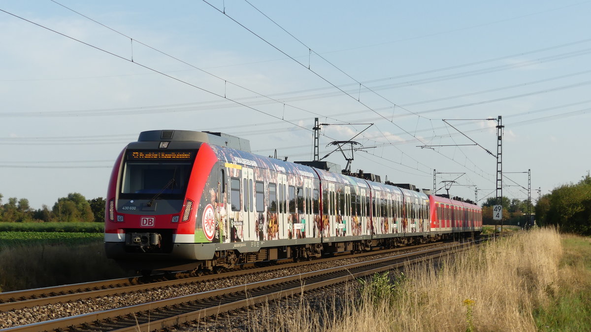 Eine Doppeltraktion bestehend aus der "Pokalsieger-Bahn" 430 100 und einem normalen 430 zur Fahrt als S7 nach Frankfurt Hbf zwischen Groß-Gerau Dornheim und Groß-Gerau Dornberg. Aufgenommen am 22.8.2018 15:08 Br111 Fan