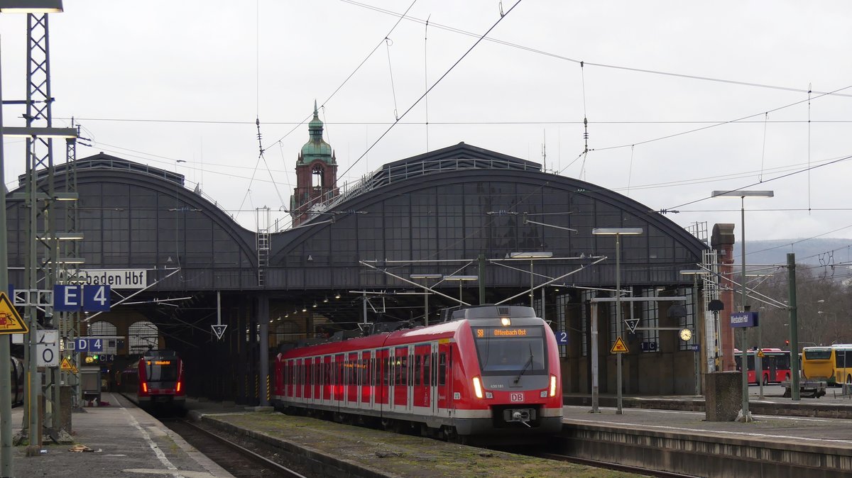 Hanau Hbf, 12.9.18: rechts S 9 nach Wiesbaden, bestehend aus 430 168 (vorn) und 166, links RE 59 nach Kelsterbach, gebildet aus HLB-1440 167 (vorn) und dem Dreiteiler 342. Hermann-Josef Weirich