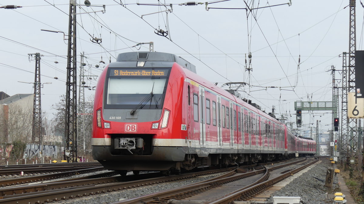 Eine Dreifachtraktion 430 in Frankfurt Oberrad. Hier verläuft die S-Bahn Strecke zwischen dem Frankfurter und dem Offenbacher Citytunnel für einen knappen Kilometer oberirdisch. Im Hintergrund ist die Frankfurter Skyline zu sehen. Aufgenommen am 29.3.2018 10:41 Br111 Fan